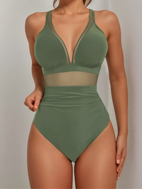 Make waves this summer with the Seaside Allure – where bold elegance meets perfect support. With its plunging neckline, mesh contrast design, and ruched high-waist detail, this swimsuit turns every beach or poolside into your runway.